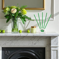 Disposez les tiges sur leur socle et laissez le parfum se diffuser naturellement, sans liquide ni flamme.